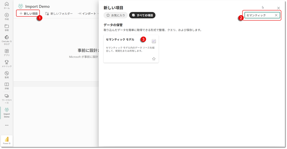 Power BI Service(Fabricポータル)上のワークスペースから新規に「セマンティックモデル」を作成します。ここが、従来「Power BI Desktopでモデルを作って発行」していた部分に相当します。